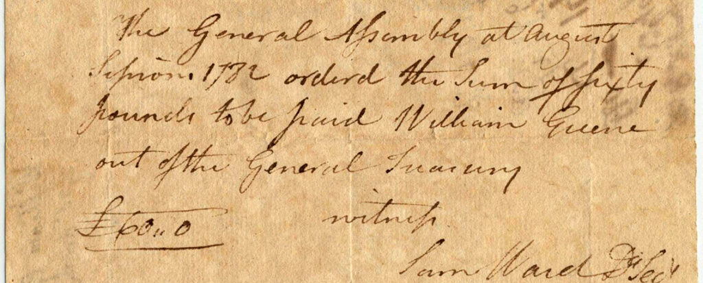 At the Varnum Memorial Armory Museum, we have an interesting American Revolutionary War period document featuring the autographs of three prominent Rhode Islanders including Esek Hopkins (first Commander in Chief of the US Navy), Governor William Greene Jr., and Samuel Ward Jr.