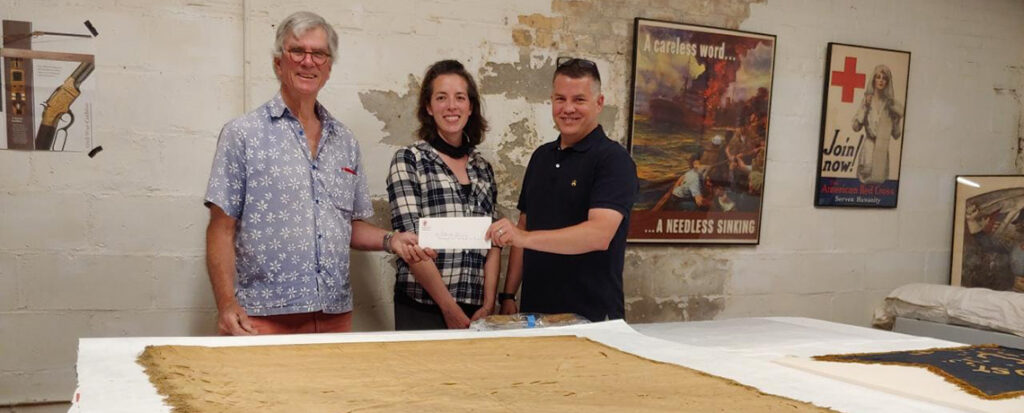 Irving C. Sheldon Jr. (President of the Rhode Island Chapter of the Society of Colonial Wars (SCW)) presented the Varnum Memorial Armory Museum with $9,000 towards the conservation and framing of the historic Bristol flags.