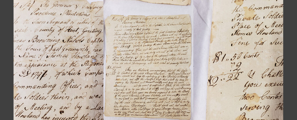 Here we have a 1797 dated arrest warrant for East Greenwich resident, Thomas Howland, for not paying his fine and late fee ($2.22 total) for skipping out on parade duty as a member of the Kentish Guards!