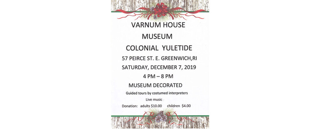 The Varnum Continentals will host its Annual Colonial Yuletide Celebration in the Varnum House Museum, 57 Pierce St., East Greenwich, RI, 02818. The museum will feature festive holiday decorations, live music, and host guided tours by docents in period costume. Built in 1773 by General James Mitchell Varnum, the museum contains a wide variety of […]