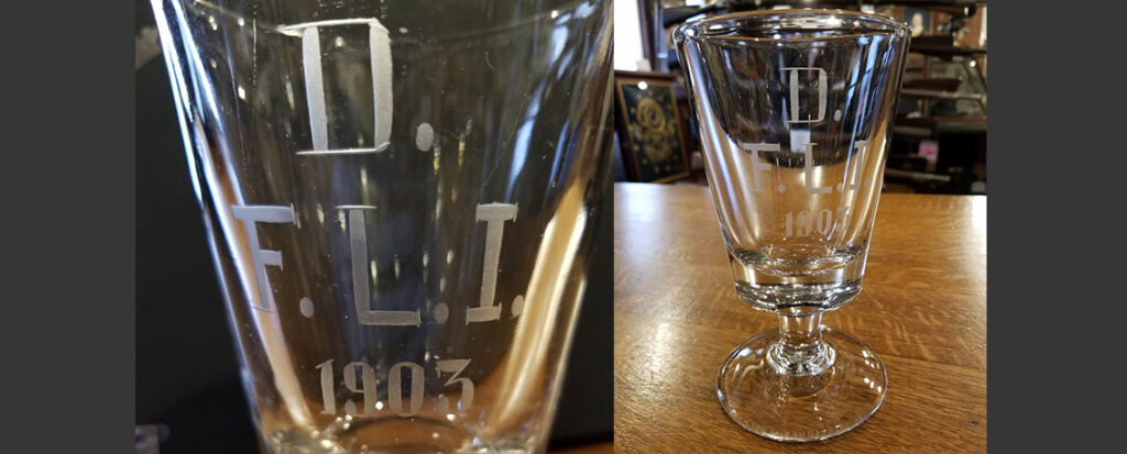 At the Varnum Memorial Armory Museum, we have a Rhode Island First Light Infantry (Company D) glass from 1903. This Rhode Island Militia (RIM) group supplied a lot of men to fight in State regiments and the RIM. It was the predecessor of the Rhode Island National Guard.