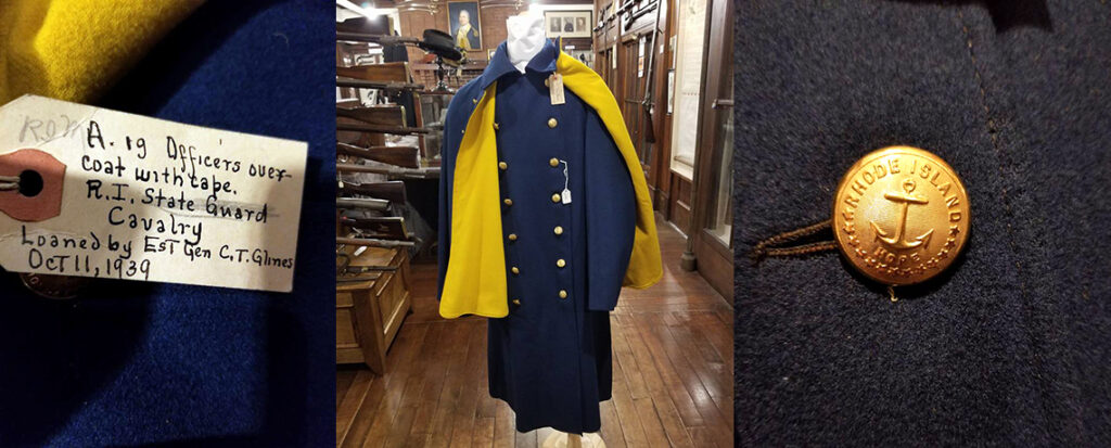 At the Varnum Memorial Armory Museum, we have a Model 1885 Cavalry Officer’s great coat with cape. It’s in remarkable condition. It was loaned to us in 1939 by General Glines. It was used by the Rhode Island State Cavalry Guard.
